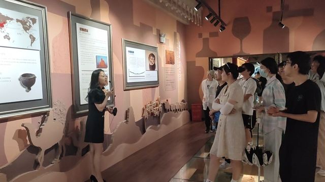跟随郝霞讲解员的步伐,学生们了解了世界葡萄酒的历史,通过文物、遗迹的展示,仿佛回到了几千年前,亲历了葡萄酒几千年的发展演变,看到了葡萄种植葡萄酒酿造技术进步与变革。展厅最有特色的当属中国葡萄酒文化展示区,展厅脚下是一条跨越西域通往西方的丝绸之路缩影,驼队载着承装葡萄酒的陶罐浩浩荡荡驶往中原。旁边长安城街头随处可见西域商人开设的酒肆,里面美酒飘香,觥筹交错之间,东西方文化交流碰撞。