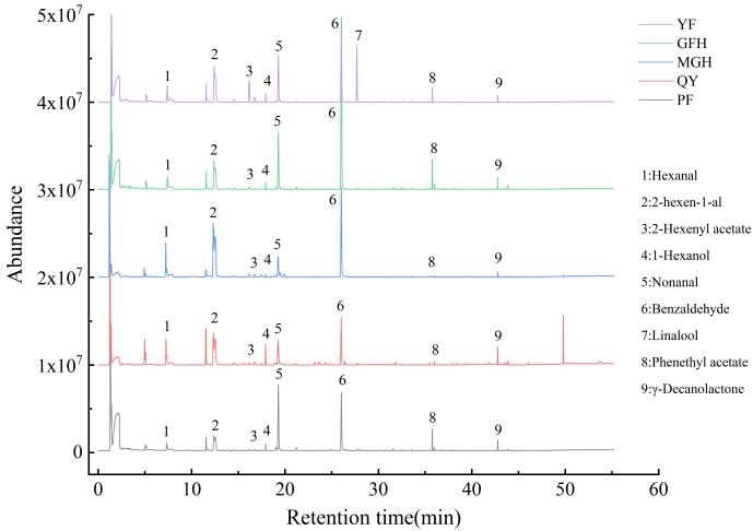为了评价蟠桃的感官特性和营养价值,采用高效液相色谱(HPLC)和顶空固相微萃取-气相色谱-质谱联用(HS-SPME-GC-MS)对新疆五个蟠桃品种的功能成分、抗氧化能力和芳香化合物进行了测定。并基于多元数据分析和OAV分析,对蟠桃的关键香气化合物进行了鉴定。