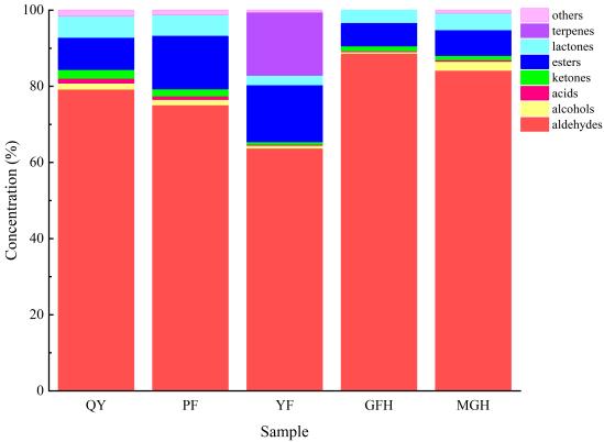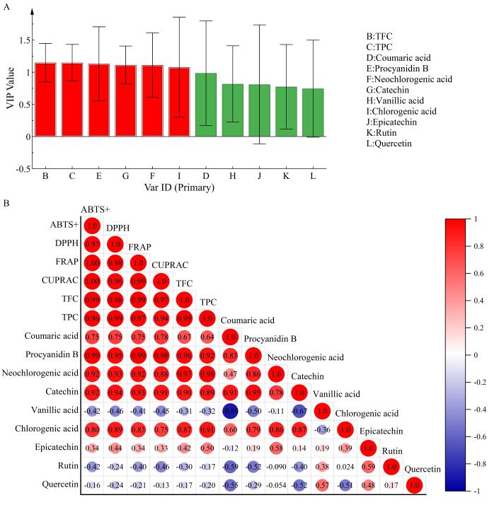 本文对新疆5个蟠桃品种的糖类、有机酸、酚类化合物、抗氧化活性和挥发性化合物进行了研究。蔗糖占总糖的70%以上,苹果酸、奎宁酸和琥珀酸占总有机酸的80%以上,对蟠桃的甜度和酸度有显著影响。绿原酸是主要的酚类化合物,对桃的抗氧化能力有显著贡献。此外,基于多元数据分析,识别了不同品种挥发性化合物的差异,并结合OAV分析鉴定了蟠桃的11种关键香气成分。这些香气成分可以作为特征标记,将蟠桃的香气与其他水果的香气区分开来。本研究通过多元数据分析了不同蟠桃品种的特征风味,为蟠桃特色风味食品的实际开发提供理论指导。也为通过香气重组技术和电子鼻分析进一步鉴定特征香气成分以及应用蟠桃的特征风味提供了理论依据。