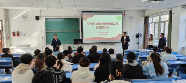 首先,雷建鹏代表学院致欢迎辞,他分别从可克达拉安琪酵母有限公司历史、发展前景、校企合作情况等多个方面为参会2024届毕业生介绍了公司的相关信息,呼吁同学们积极投递简历,并预祝宣讲会取得圆满成功。