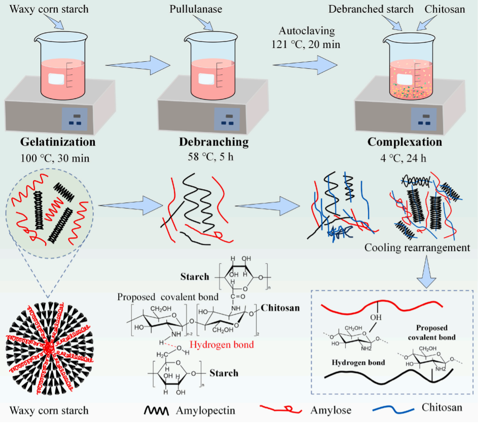 本研究采用双修饰技术开展了创新性研究,一是通过脱支酶(普鲁兰酶)选择性水解α-1,6-糖苷键而形成低分子量的线性短链分子(Debranched Starch, DBS),使其分子范围处于聚合度(DP)20与60之间。二是在形成短程有序过程中,通过分子嵌入技术使其与壳聚糖形成复合物,在诱导条件下,两类多聚物形成共结晶。