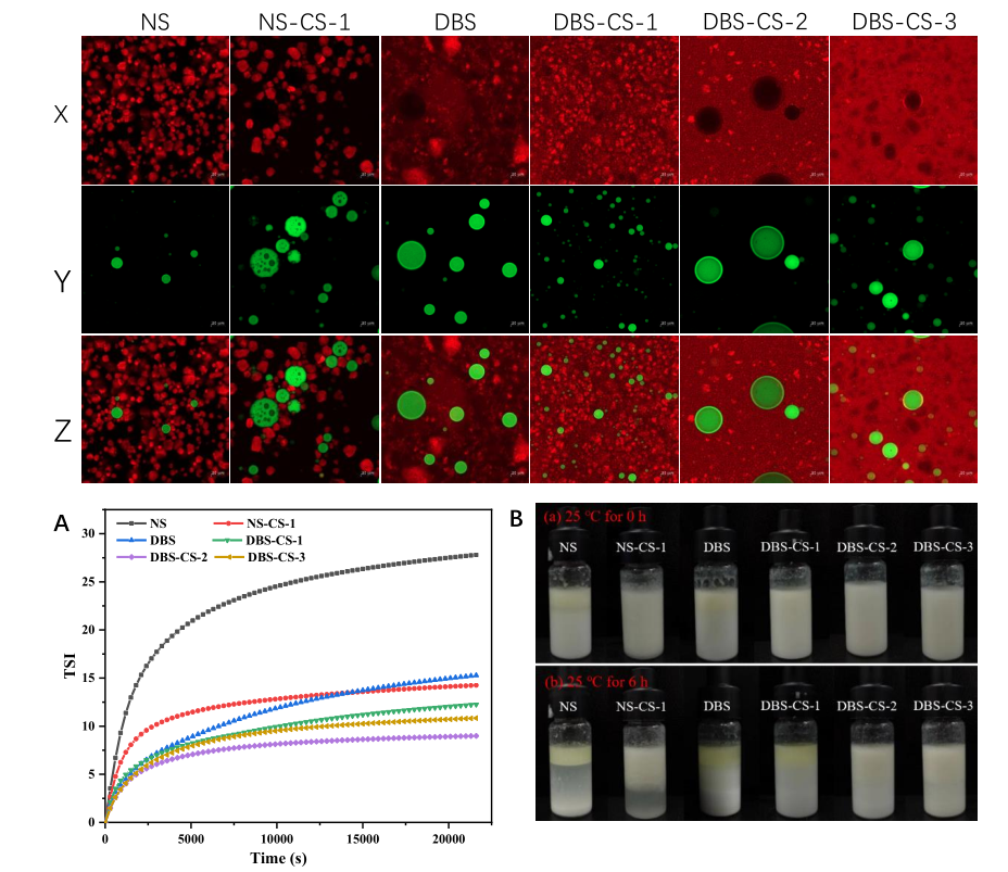 由该复合物制备的Pickering乳液的结构特征和流变性能的研究,发现复合物DBS-CS Pickering乳液比对照样NS-CS Pickering乳液具有更好的乳化稳定性和更好的流变性能。以DBS-CS复合物为载体制备的姜黄素Pickering乳液可有效提高姜黄素的包封率(82%以上)和生物利用度(14%以上),这为生物活性物质的潜在新载体的开发提供新的选择。本团队还持续开发该新材料在其他生物领域中的应用。