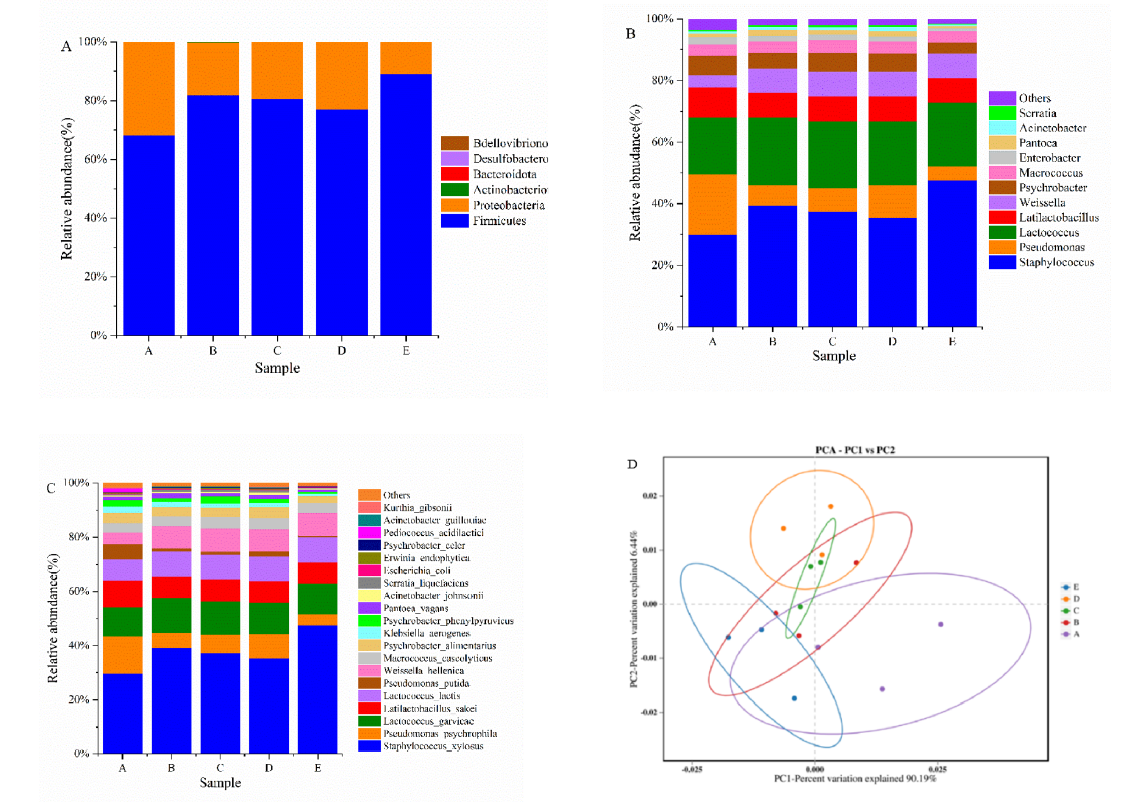 作为新疆传统的发酵肉制品,熏马肠因其独特的风味、质地和营养价值闻名。熏马肠的自然发酵与使用特定发酵菌株的香肠不同,依赖于生肉中存在的微生物和发酵环境所形成动态的微生态环境。发酵香肠中微生物的差异性主要源于不同的国家、地区和加工方法。此外,随着发酵的进行,微生物的种类和数量也会发生变化。总的来说,参与发酵的微生物,如乳酸杆菌属(Lactobacillus)、魏斯氏菌属(Weissella)和葡萄球菌属(Staphylococcus),对香肠的特定特性和整体品质有显著的贡献。发酵食品的风味是影响消费者接受度的关键因素。微生物已被认为是这些食品风味特征发展的关键贡献者。因此,许多研究人员进行了广泛的调查,以探索发酵食品中微生物与风味之间的关系。