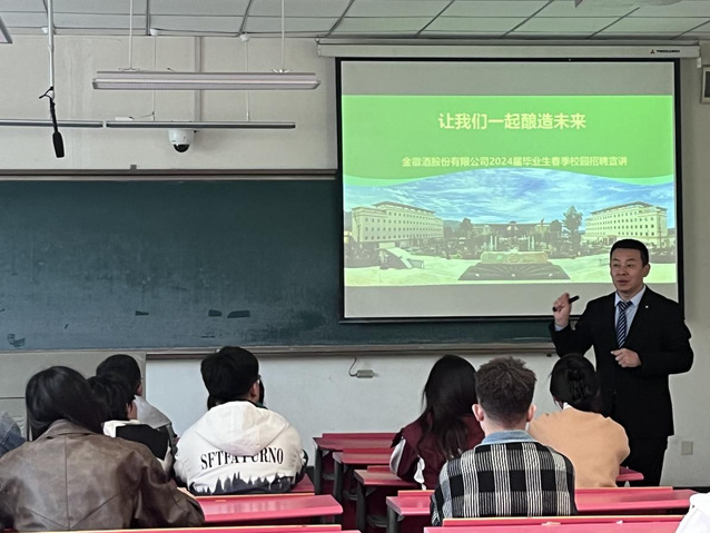 会议伊始,学办负责人张苗苗老师对金徽酒股份有限公司来我院开展专场招聘宣讲会表示热烈的欢迎。陈保康围绕白酒与白酒行业的概况,金徽酒的简介,公司情况,主营业务,招聘岗位,招聘要求,工作流程,工资福利待遇,简历投递方式等做了详细介绍。