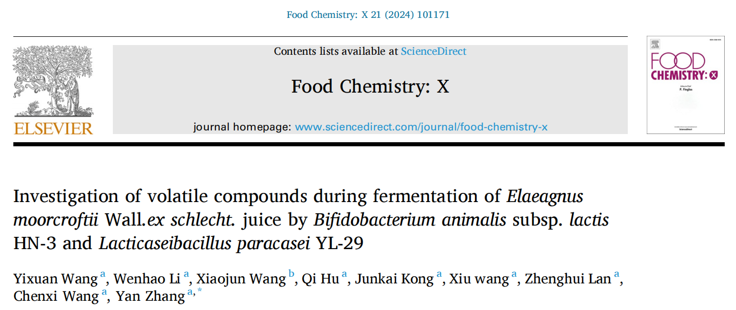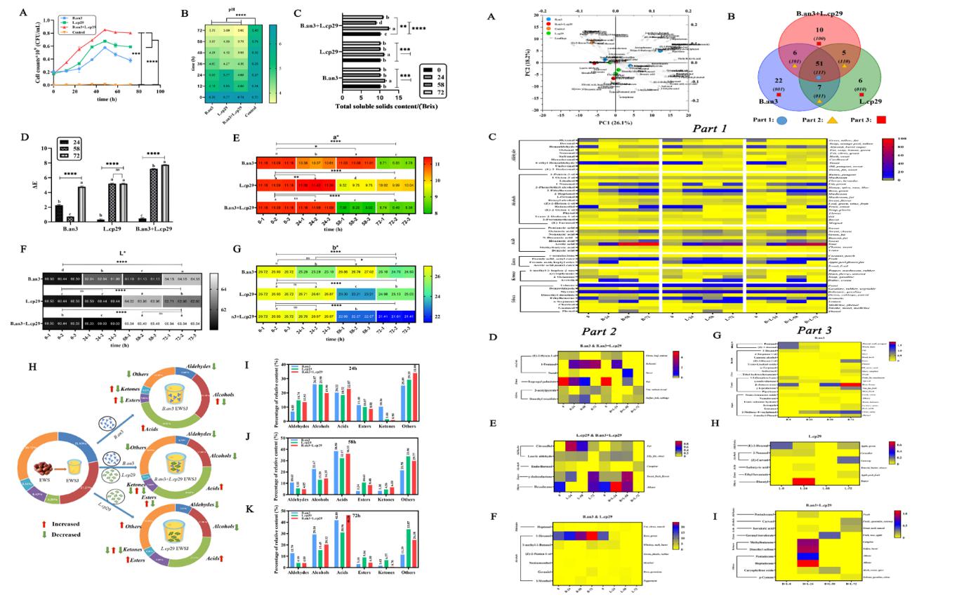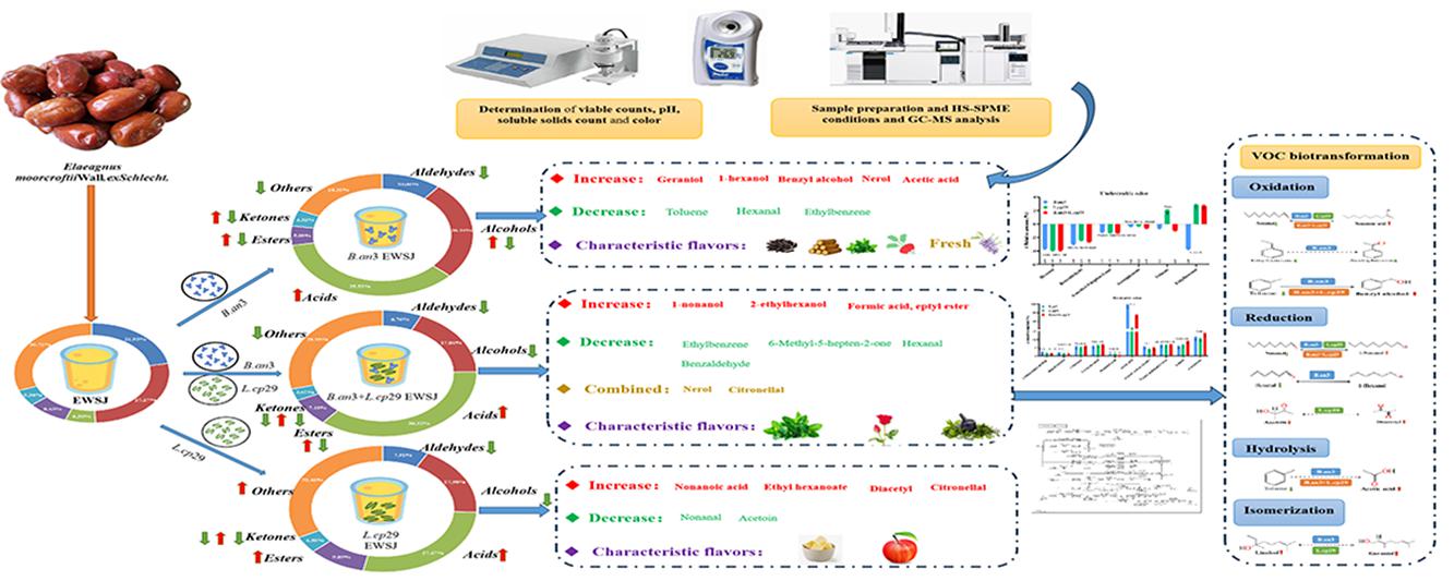 本研究比较了动物双歧乳杆菌乳亚种HN-3(B.an3)和副干酪乳酪杆菌YL-29 (L.cp29) 以单菌和混菌发酵对大果沙枣果汁(EWSJ)的挥发性气味(VOCs)的影响和探讨了对气味成分的转化机制。然后,结合 HS-SPME-GC-MS技术,研究 VOCs 成分的变化, 分析 B.an3和L.cp29相互作用,并探索 B.an3单菌发酵、L.cp29 单菌发酵和 B.an3 + L.cp29 混合发酵过程中 VOCs 生物转化的机制。这项工作为生产独特风味的动物双歧乳杆菌乳亚种HN-3(B.an3)发酵大果沙枣果汁,副干酪乳酪杆菌YL-29 (L.cp29) 发酵大果沙枣果汁和B.an3 + L.cp29混合发酵大果沙枣果汁提供了新的见解。此外,两种益生菌混合发酵更有利于开发具有更强功能活性的益生菌发酵植物产品。