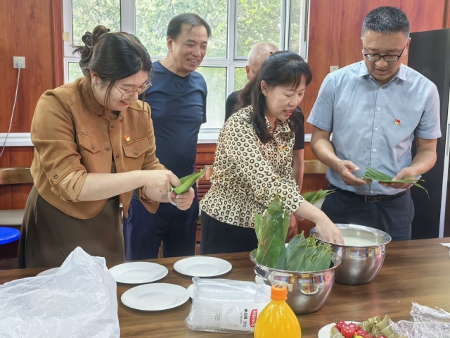 活动尾声,一场别开生面的端午文化体验将气氛推向高潮。学院郭欣、毛晓英两位老师化身“非遗讲师”,现场示范粽叶折叠、填料捆扎等传统技法,耐心指导初次尝试的教师掌握包粽技巧。在一片欢声笑语中,清香的糯米与饱满的馅料在指尖化作棱角分明的粽子,传递出浓浓节日温情,更凝聚起两支部同心共建的深厚情谊。