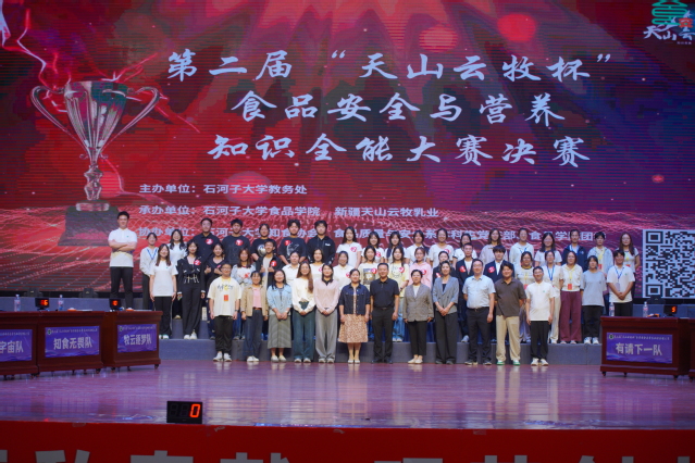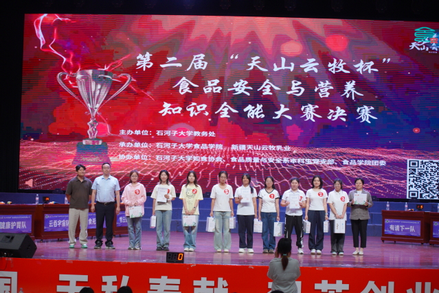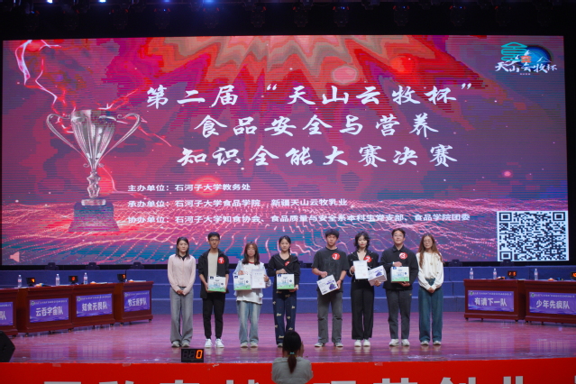 9月7日,石河子大学北区大会堂灯光如昼、掌声雷动,由石河子大学教务处主办,新疆天山云牧乳业有限责任公司、beat365承办的第二届“天山云牧杯”食品安全与营养知识全能大赛在此迎来终极对决。从线上万人海选、实操技能沙场,到短视频创意答辩,8支“学霸战队”一路过关斩将,最终站上最高擂台,用知识与激情献上了一场“舌尖上的巅峰盛宴”。